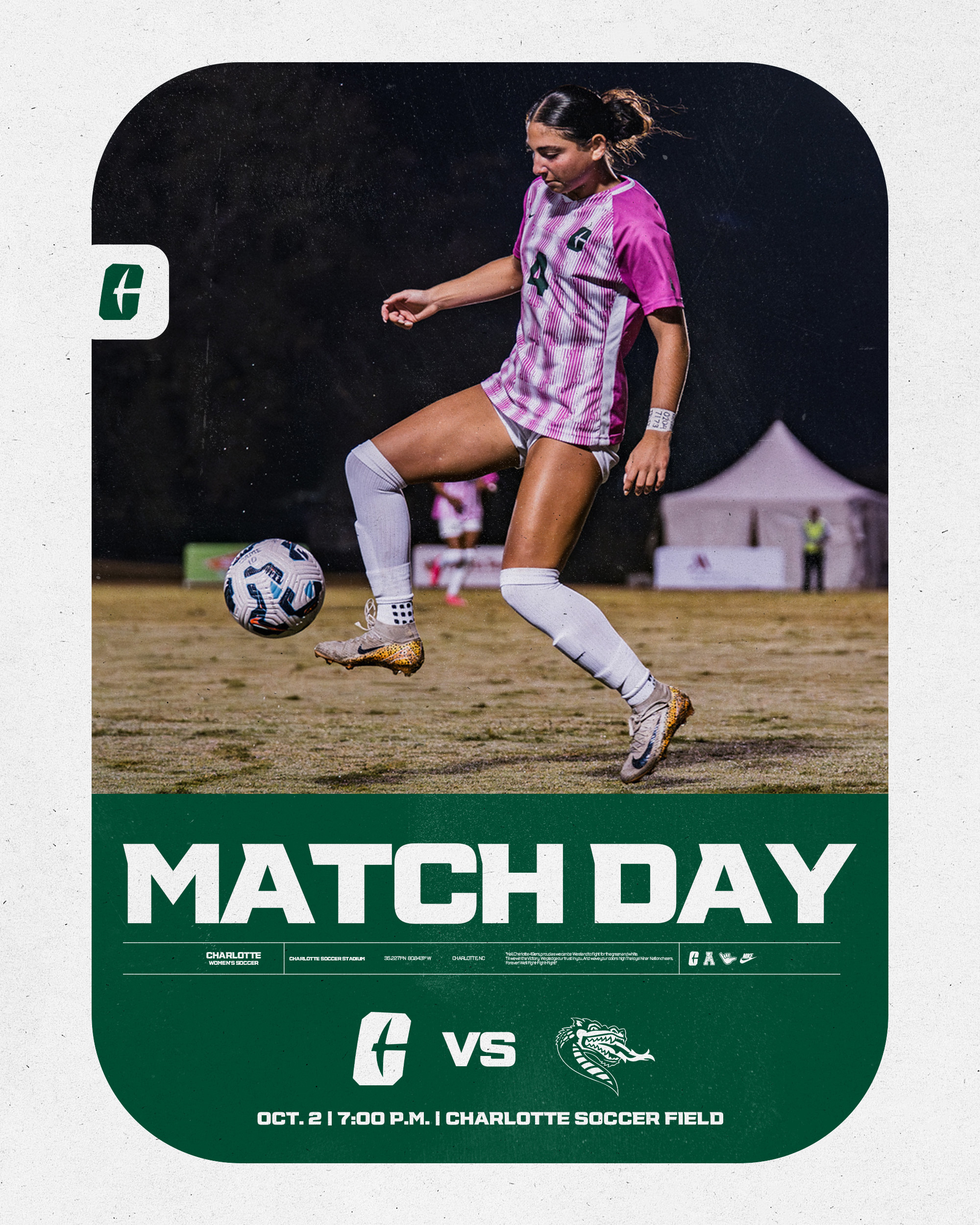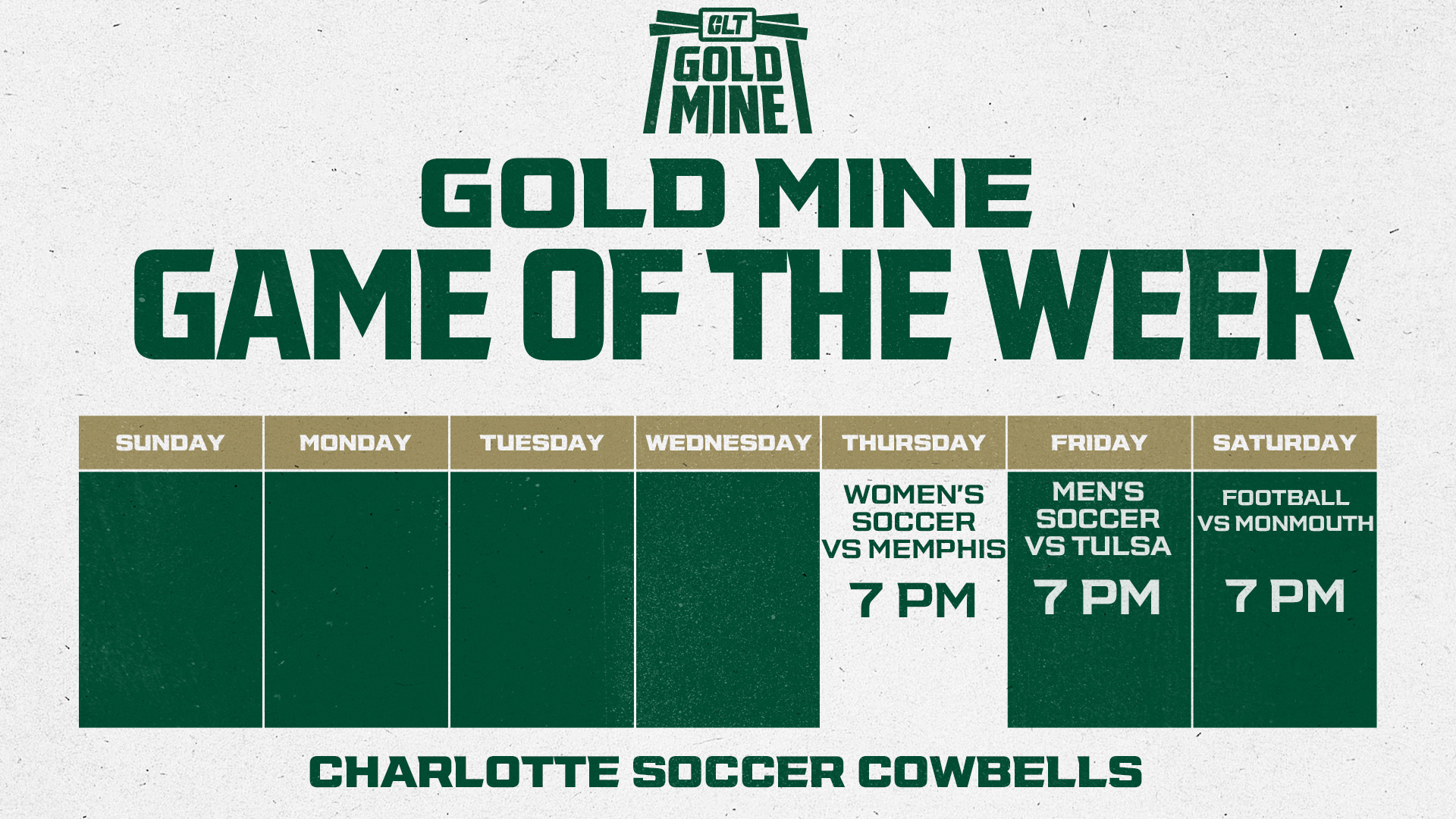 Niner Nation, get ready to green out the Charlotte Soccer Field in this week's Gold Mine Game of the Week! Kickoff is at 7pm so make sure to show out in this primetime conference matchup!