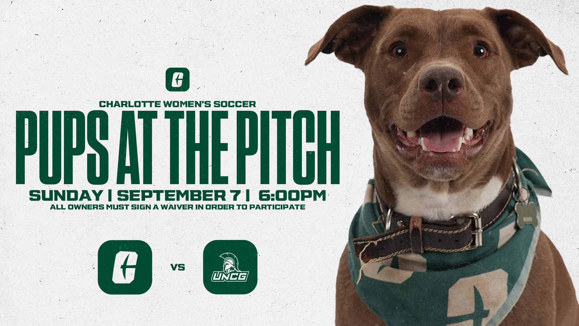 Pups at the Pitch is back for the 2025 season! Bring your pups and spend your Sunday evening at Charlotte Soccer Field as the Women's team hosts the UNCG Spartans at 6 pm.